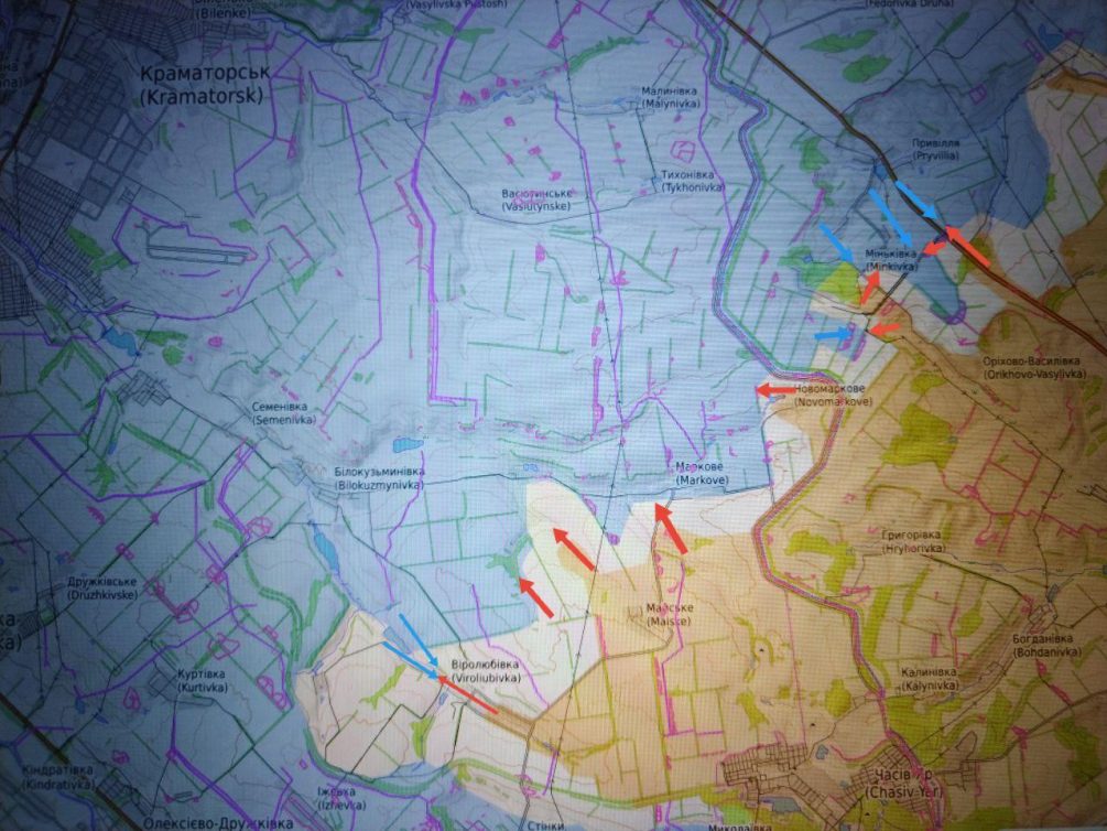 Наиболее ожесточённые встречные бои развернулись на рубеже Приволье — Миньковка — Новомарково. Противник пытается отбить Миньковку, бывшую ключевым узлом его обороны за каналом Северский Донец — Донбасс. Потеря Миньковки и Новомарково создаёт для ВСУ реальную угрозу, так как открывает российским войскам путь на стратегические высоты западнее Краматорска