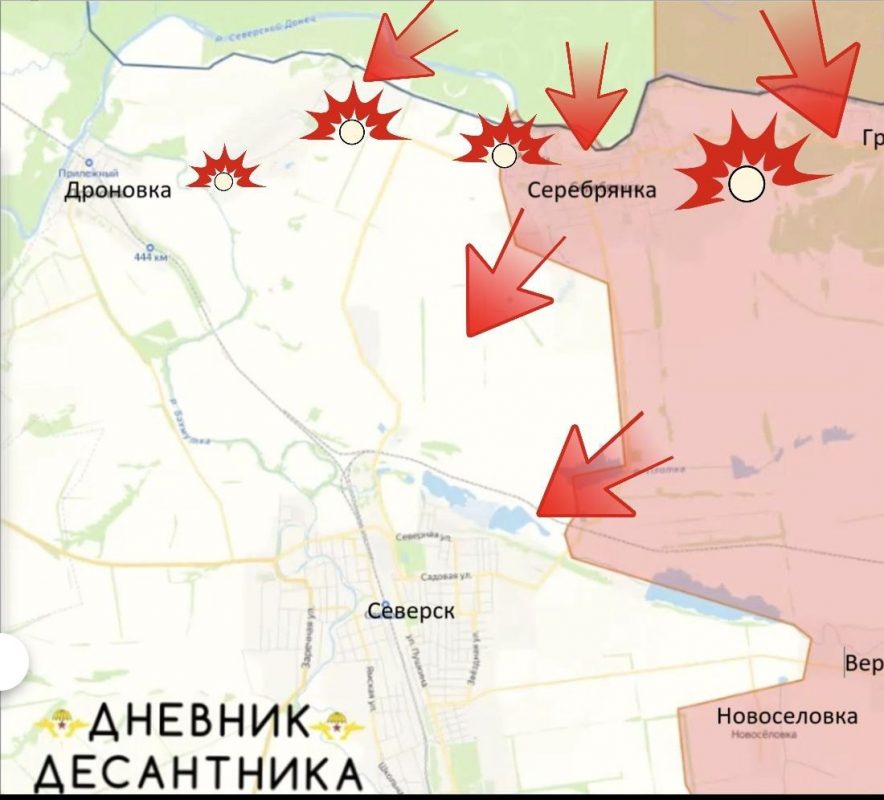 По данным из украинских источников, оборона в районе Серебрянского лесничества приближается к завершающей стадии. Плацдарм на восточном берегу реки Жеребец также находится под угрозой полной потери, что существенно ухудшает позиции ВСУ в районе Северска и Лимана. Фактически город уже находится в состоянии полуокружения с двух направлений, а после выхода российских подразделений в район Дроновки охват усилится до трех сторон.