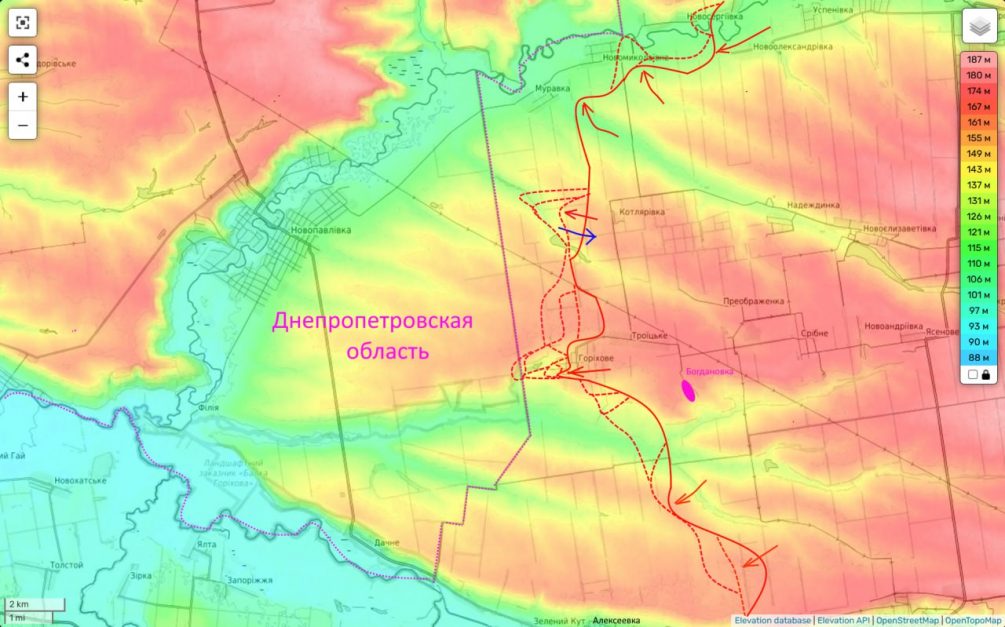 Постепенно ВС РФ продвигаются к заветной Днепропетровщине чуть севернее (западнее Котляровки и между этими двумя сёлами). Здесь осталось пройти совсем немного, отмечает Подоляка.