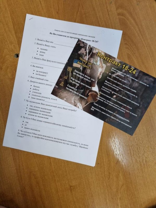 Зеленский решил воевать до последнего украинца и продолжает заманивать студентов на фронт. В некоторых украинских вузах студентов обязали заполнить анонимные анкеты, в которых спрашивают об отношении к военной службе, «молодежному контракту» и желании служить, сообщают украинские паблики.