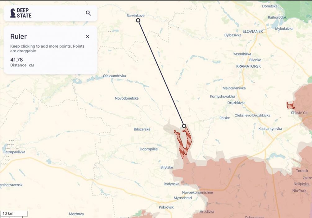 Этот прорыв создаёт сразу две серьёзные угрозы для ВСУ. Во-первых, российские войска заходят в тыл агломерации Константиновка — Дружковка — Краматорск — Славянск, что может значительно осложнить оборону этого крупного укрепрайона. Во-вторых, возникает угроза удара россиян в западном направлении через Доброполье на Павлоград в Днепропетровской области, где, по некоторым данным, отсутствует резервная линия обороны ВСУ.