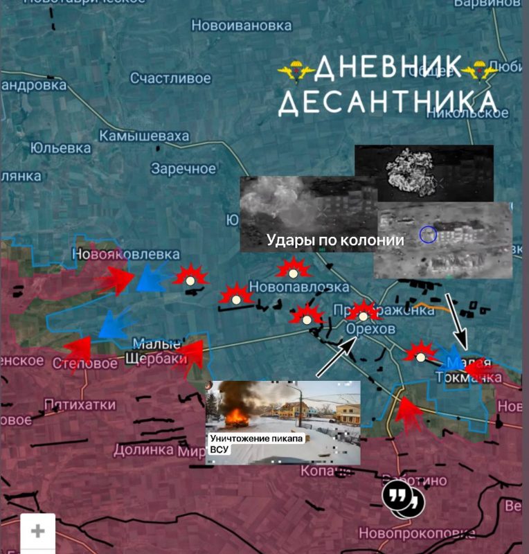 В район Малой Токмачки центром напряженных боев стала территория местной тюрьмы, где российским подразделениям удалось закрепиться в одном из трех двухэтажных зданий. Два других здания были полностью разрушены. Ситуация здесь крайне динамична: контроль над объектом неоднократно переходит из рук в руки. После того как ВСУ начали активно использовать беспилотники и авиационные боеприпасы по занятому зданию, российские силы были вынуждены оттянуть часть подразделений с территории колонии, нанося удары артиллерией и дронами по контратакующим группам ВСУ.