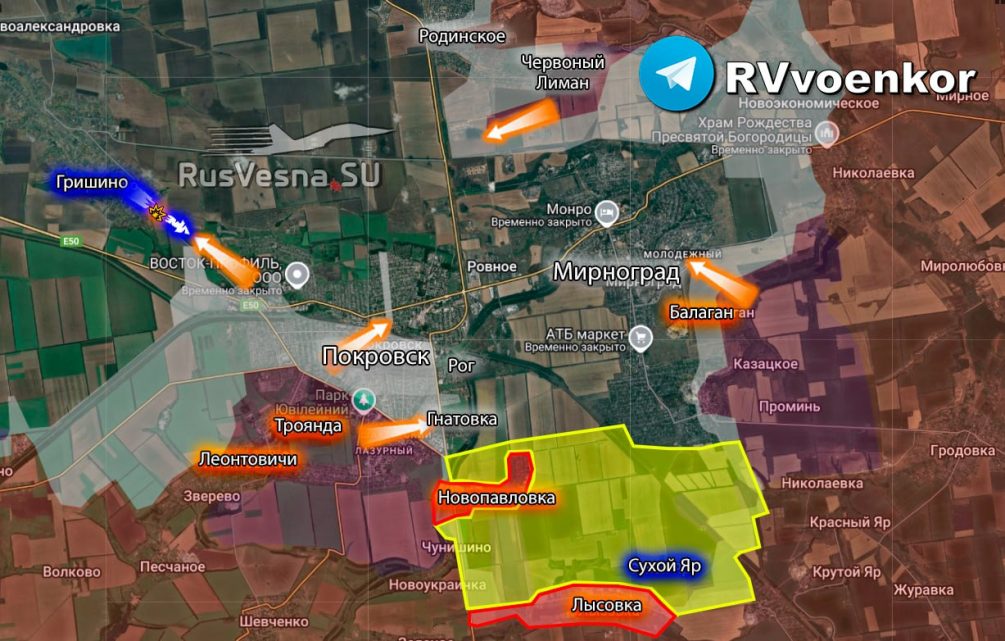 Главная угроза, по данным из украинских источников, скрыта южнее и юго-восточнее от Покровска. В районе поселков Новопавловка, Сухой Яр и Лысовки украинские подразделения, по сути, оказались в «мешке». Их положение сравнивают с «дном», куда постепенно стягиваются российские войска.