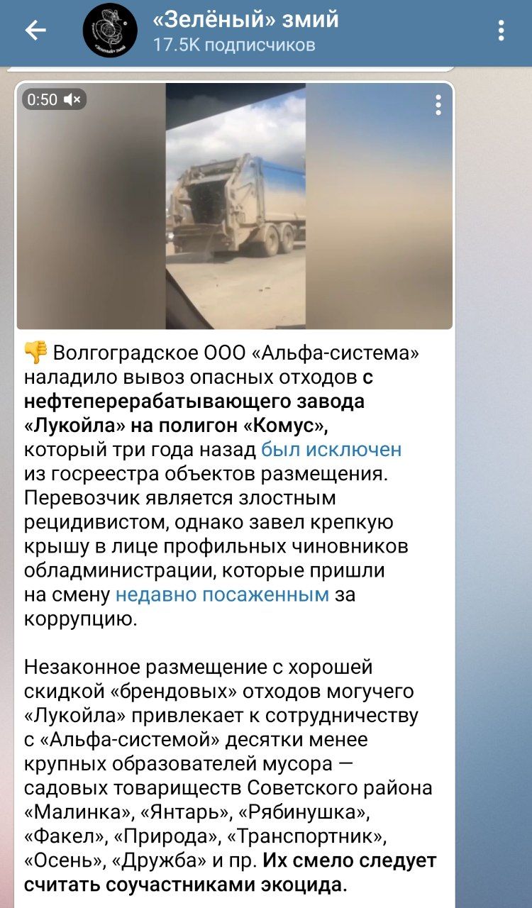 «Незаконное размещение с хорошей скидкой «брендовых» отходов могучего «Лукойла» привлекает к сотрудничеству с «Альфа-системой» десятки менее крупных образователей мусора - садовых товариществ Советского района «Малинка», «Янтарь», «Рябинушка», «Факел», «Природа», «Транспортник», «Осень», «Дружба» и пр.» - говорится в Телеграм-канале.