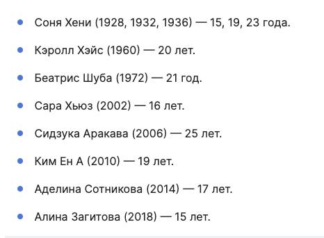 А ассистент кафедры лечебной физкультуры и спортивной медицины СЗГМУ им. И.И. Мечникова Екатерина Брынцева напомнила изданию, что раньше олимпийскими чемпионами в фигурном катании были 20-летние спортсменки, сейчас же этот вид спорта значительно помолодел. Самой «старой» Медж Сайерс, когда она выиграла золотую медаль на ОИ в 1908 году, было 28. Теперь же с каждым годом фигуристки молодеют, напомнила врач функциональной диагностики в спорте «Училище олимпийского резерва № 1».