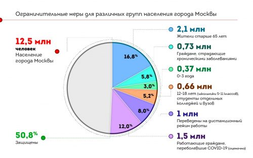 Мэр заверил жителей столицы, что не хочет вводить крайние меры в виде комендантского часа или жесткого локдауна. Наоборот, Собянин ищет средний путь: между закрытием города и полным отказом от ограничительных мер, чтобы не ударить по экономике, не лишать людей работы, но остановить распространение ковида. И привел простые подсчеты, показывающие, как 50% жителей столицы (6,5 млн человек) удалось "запереть" дома. Это 2,1 млн жителей Москвы, кому за 65, еще 700 тысяч хронически больные, 660 человек - старшеклассники, студенты, которые переведены на дистанционку, еще 370 тысяч малышей до 3 лет вместе с мамами остаются дома и один миллион сотрудников, которые работают в удаленном режиме. Сюда же Собянин добавил 1,5 млн москвичей, уже переболевших ковидом.