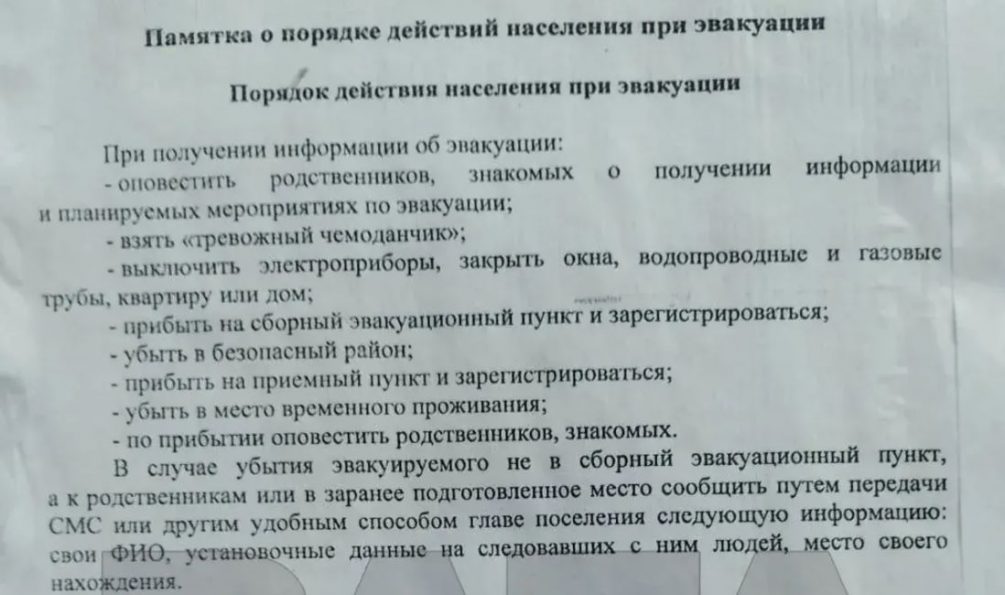 В Белгородской области появились памятки для местных жителей, на которых указан порядок действий при эвакуации. Их вывесили во многих населенных пунктах региона. Фото листовок публикует Телеграм-канал Baza.