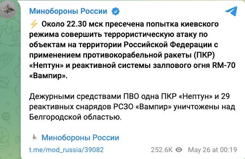 Дежурные средства ПВО уничтожили «Нептун» и 29 реактивных снарядов РСЗО Vampire над Белгородской областью, сообщили в Минобороны РФ.