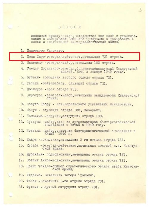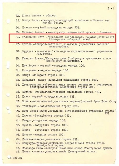 Как сообщается в архивных материалах, генерал Исии Сиро собирал приговоренных к смертной казни военнопленных и испытывал их мучительной смертью. Он ставил на них опыты, заражая человека либо индивидуально через конфеты, содержащие не орехи, а сибирскую язву, либо целыми камерами, разрабатывая специальные «бомбы», начиненные зараженными блохами и смертоносными бактериями.