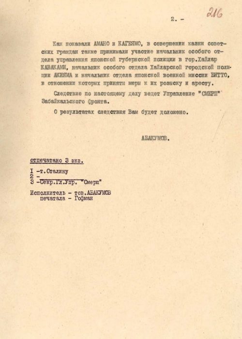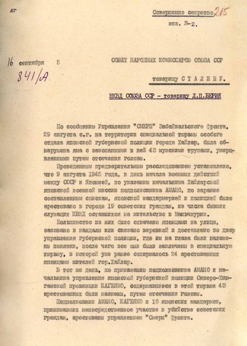 В преддверии даты окончания Второй мировой войны ФСБ России рассекретила архивный документ, согласно которому сотрудники японской разведки, узнав о вступлении Советского Союза в войну с Японией, массово казнили граждан СССР путем обезглавливания. Речь идёт о докладной записки начальника советской военной контрразведки «СМЕРШ» Виктора Абакумова на имя Иосифа Сталина. Материалы размещены на сайте ведомства.