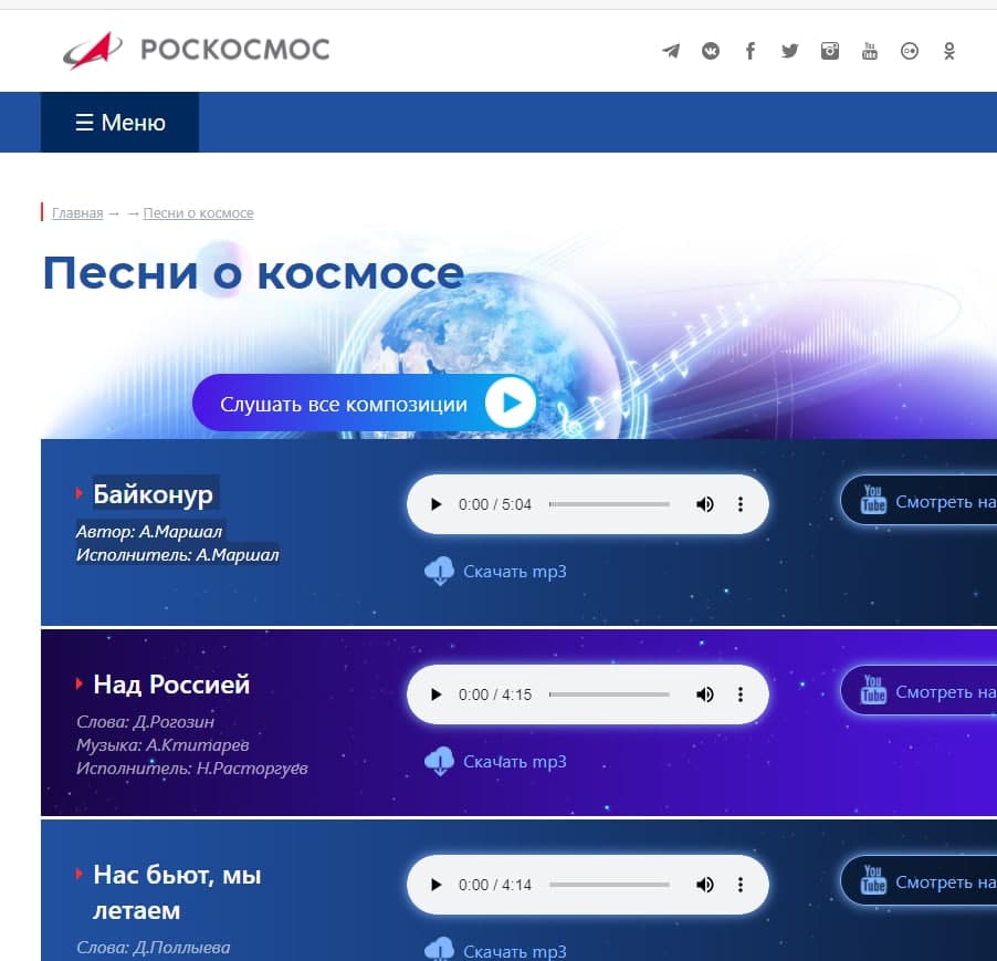 Комичность ситуации усугубилась тем, что сегодня, 10 ноября, прямо с утра на официальном сайте Роскосмоса внезапно появился раздел с песнями о космосе — всего 12, и пять из них написаны самим Дмитрием Рогозиным. В числе авторов других композиций – супруга главы Роскосмоса Татьяна, а также бывшая спичрайтер Путина, Медведева и Ельцина Джахан Поллыева.