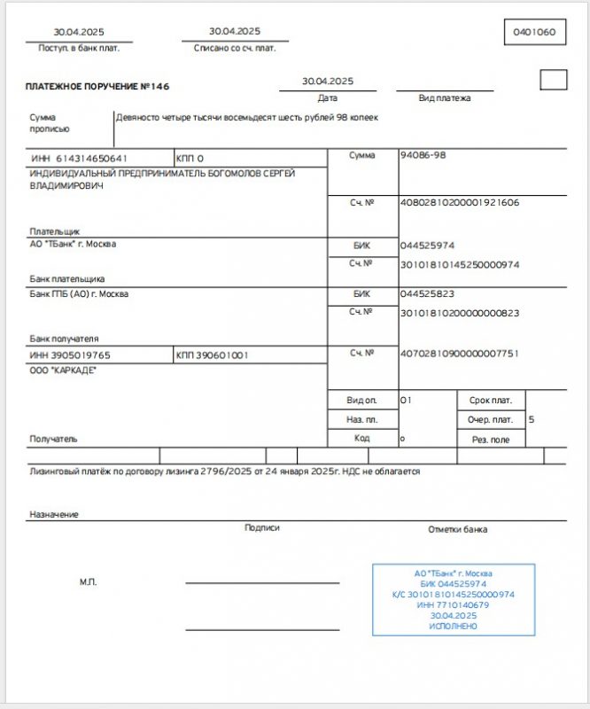 30 апреля Богомолова уведомили ростовчане, что согласно условиям лизинга, он должен полностью оплатить использование машины в апреле. В тот же день вся сумма долга была оплачена Сергеем платежным поручением №146 от 30.04.2025 г.