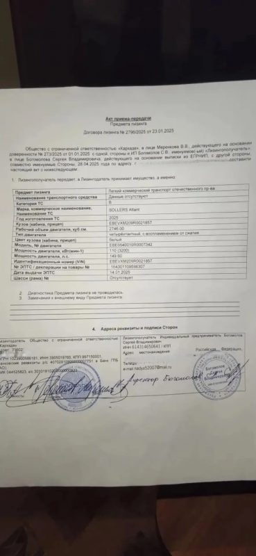 Действительно, на сегодня решением московских менеджеров компании ООО «Каркаде» ситуация официально выглядит, как прекращение договора лизинга № 2796/2025 от 24.01.2025 только 25 сентября 2025. Данную информацию можно увидеть на портале деловой информации «Руспрофайл». При этом никаких объяснений, как с этим согласуется акт приема-передачи автомобиля от 28 апреля в ростовском подразделении компании, московский офис ООО «Каркаде» Сергею Богомолову давать не стал.