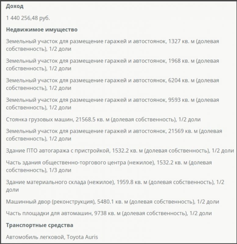 Наиболее полный перечень имущества Ольга Гапонова задекларировала в 2018 году. Она указала в своем владении несколько участков для гаражей и автостоянок, общей площадью почти 45 тысяч квадратных метров.