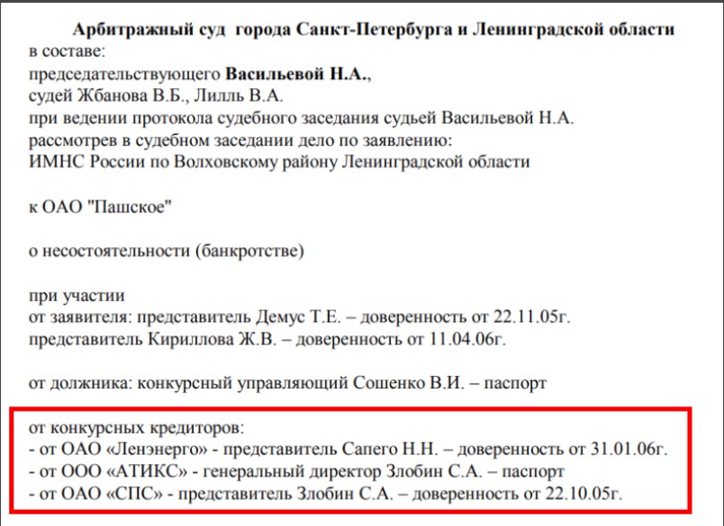 Долг предприятия к тому моменту составлял 203 миллиона рублей, но гораздо интереснее личности кредиторов – «Атикс» и «СПС». Обе компании представлял Сергей Злобин, которого называли сожителем Ольги Гапоновой.