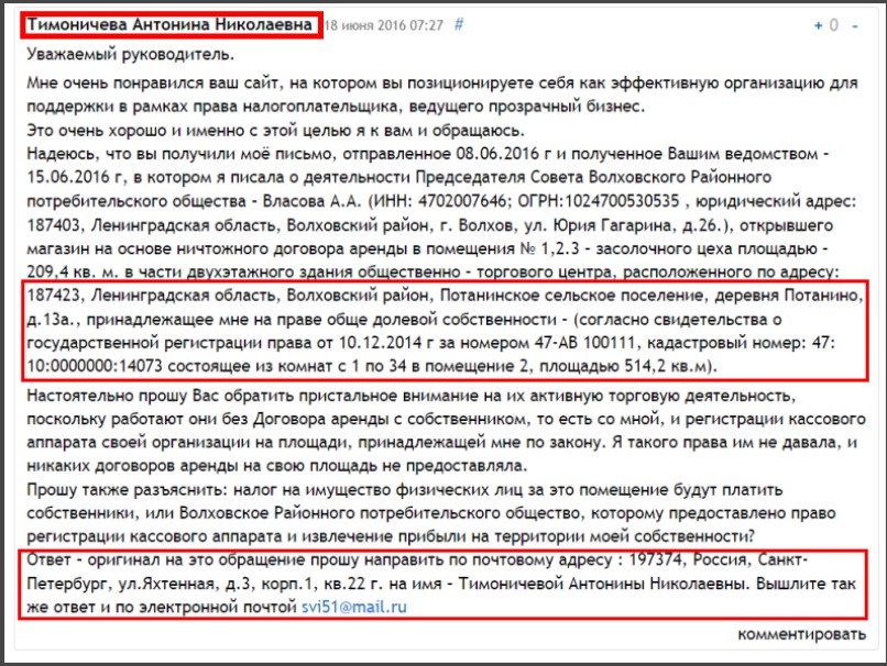 Каких-либо юрлиц, записанных на Тимоничеву нам обнаружить не удалось. Зато нашли жалобу на работу Межрайонной ИФНС №5 по Ленинградской области. Как написала Тимоничева, некий бизнесмен якобы незаконно организовал магазин в принадлежащем ей помещении. Адрес помещения и его площадь полностью совпали с данными из объявления о продаже объекта в селе Потанино, за которое судилась Ольга Гапонова. А адрес, по которому Тимоничева требовала прислать ей ответ, полностью совпал с адресом Владимира Сошенко, размещавшего объявления о продаже объектов Гапоновой. Это дает основания полагать, что Тимоничева и Сошенко, как минимум, совместно проживают.