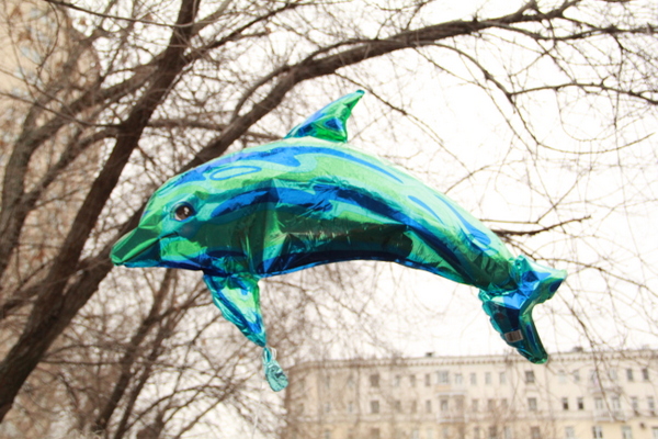 Активисты принесли надувного и символичных игрушечных дельфинов под здание Посольства Японии.