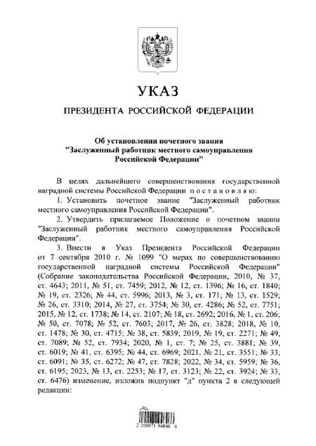 «В целях дальнейшего совершенствования государственной наградной системы РФ постановляю: установить почетное звание «Заслуженный работник местного самоуправления Российской Федерации», — следует из документа, который появился на официальном портале правовой информации.