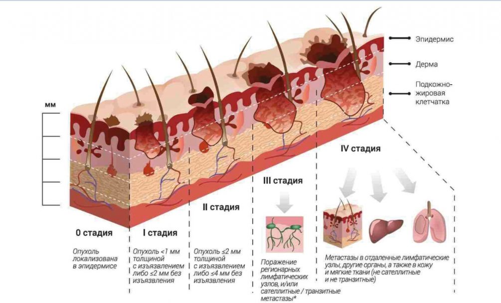 Признаками меланомы является изменение существующей родинки. Всего определяют следующие стадии меланомы: