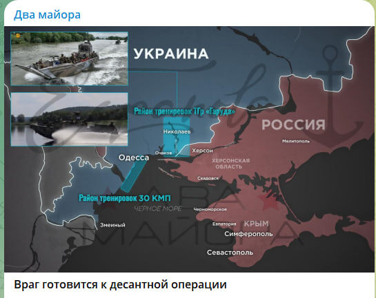 Авторы другого телеграм-канала «Два майора» тоже подтвердили активную подготовку ВСУ. По их данным, морпехи и ССО Украины проводят ежедневные тренировки в бассейне Южного Буга. В наличии у украинских десантников 8 финских катеров.