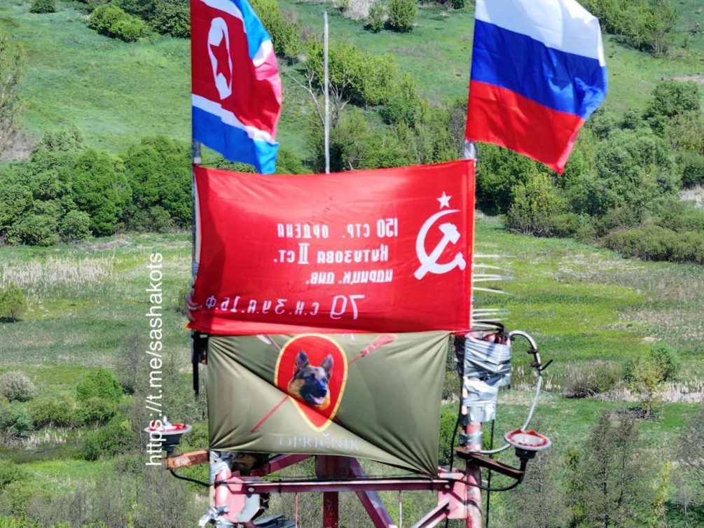 «Российский боец с позывным «Заря», забравшись на вышку сотовой связи, повесил Знамя Победы, флаги России и КНДР. Под визг надрывающегося дрон-детектора он обратился к ветеранам Великой Отечественной: «Я заверяю вас и даю вам слово, что ваше дело мы доведем до конца. С Праздником, товарищи! Ура!»