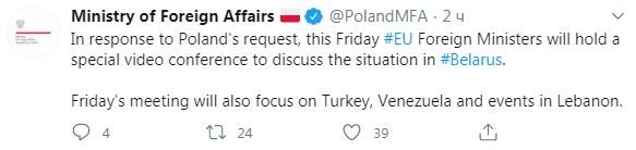 Также сегодня стало известно, что 14 августа в ЕС пройдет заседание Совета на уровне глав МИД. Европейские министры планируют обсудить ситуацию в Белоруссии. С предложением о встрече выступила Варшава, сообщает МИД Польши в Twitter.