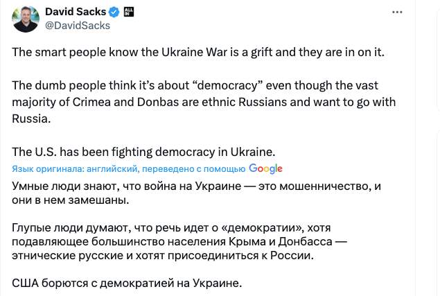 Неслучайно другой американский миллиардер Илон Маск подтвердил слова Дэвида Сакса о том, что администрация президента Джо Байдена лжет американцам о конфликте на Украине.