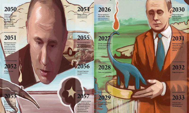 В календаре нет дат и даже месяцев, а изображенные в нем события являются плодом воображения. По прихоти художника Путин то атакует воздушные шарики, сидя на коне как Георгий Победоносец, то выгуливает муравьеда как в свое время Сальвадор Дали. Календарь носит название «Путин на каждый день до 2120 года».