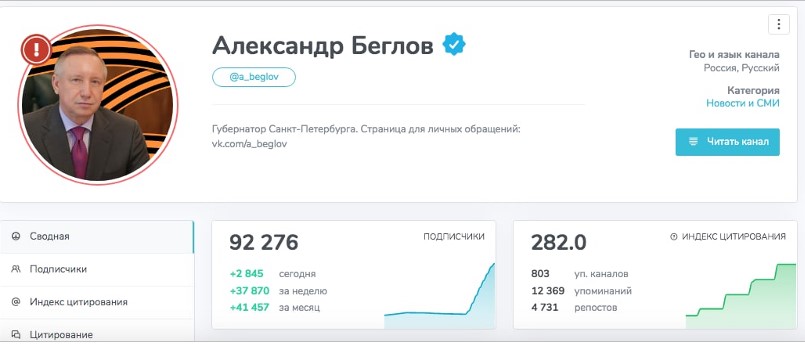 Сервис TGStat обвинил канал губернатора Петербурга Александра Беглова в накрутке подписчиков, сообщает «Деловой Петербург». Градоначальник больше недели не появляется на публике. По информации СМИ, это может быть связано с осложнениями после проведения косметической операции. Пока Беглов продолжает прятаться, его официальный Telegram-канал переживает взрывной рост популярности. В день на него подписываются порядка пяти-шести тысяч «новых пользователей». За последний месяц количество подписок превысило 41 тысячу, при условии, что за неделю на канал подписались 37 тысяч «человек».