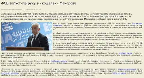 Сотрудники ФСБ 30 июля 2020 года задержали депутата ЗакСа Петербурга Романа Коваля по подозрению в получении взятки в размере 15 миллионов рублей. По версии следствия, политик в присутствии своего помощника Гришина получил взятку в виде денег и имущества. Коваль мог воспользоваться своим должностным положением при принятии «депутатской поправки» - инструмента, позволяющего членам ЗакСа корректировать городской бюджет.