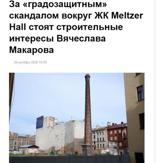В октябре 2020 года депутаты Заксобрания во главе с Макаровым отправили второй запрос на имя губернатора с требованием остановить строительство ЖК Meltzer Hall на Петроградской стороне. Политики были уверены, что стройка идет с нарушением федерального и городского законодательства и несет угрозу культурно-историческому наследию Северной столицы. Однако застройщик в лице «Альфа Фаберже» и авторы проекта ЖК «Студия 44» утверждали, что строительство элитного комплекса пытаются сорвать «влиятельные люди». СМИ предполагали, что за этим могут стоять строительные интересы Макарова и его семьи.