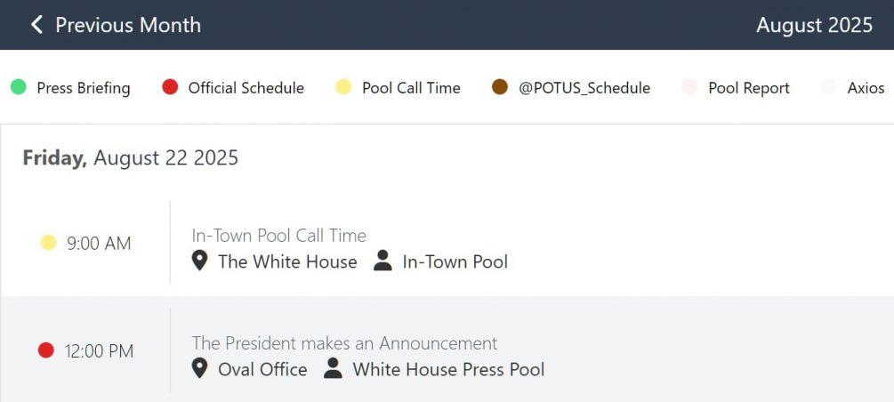 Президент США Дональд Трамп назначил выступление на 22 августа в 19:00 мск. По информации Белого дома, президент произнесёт заявление из Овального кабинета. Но о чём конкретно будет речь — официально не уточняется. А значит, можно ожидать чего угодно: от миротворческих инициатив до новых торговых пошлин или громких обвинений в адрес «коррумпированного Байдена».