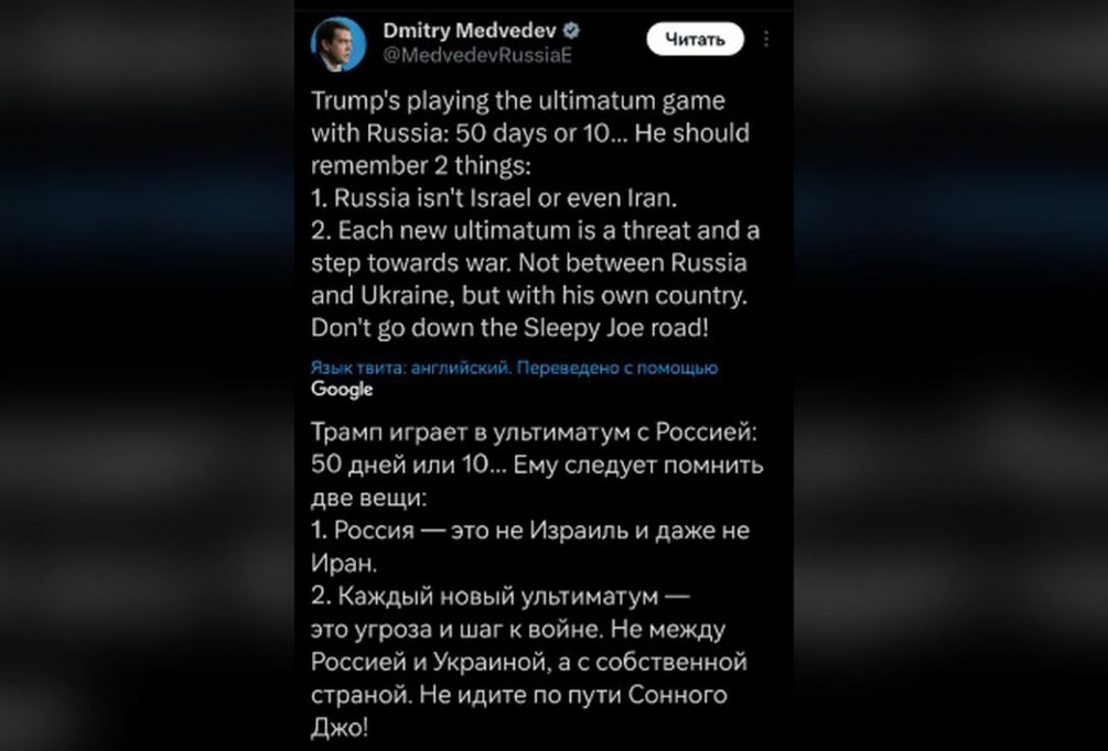 Медведев написал всё по делу и предложил Трампу «не играть в ультиматум с Россией», так как это — реальная угроза войной.