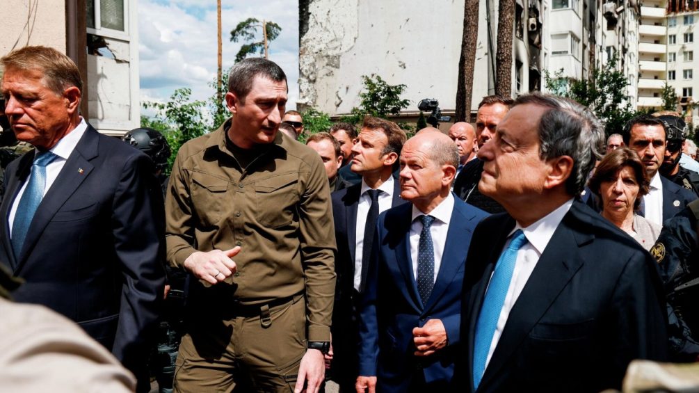 Поездка политиков долгое время держалась в тайне по соображениям безопасности. Но сегодня информация была раскрыта, когда появились фотографии Макрона, Шольца и Драги из поезда, на котором они прибыли в Ирпень, расположенный в Киевской области.