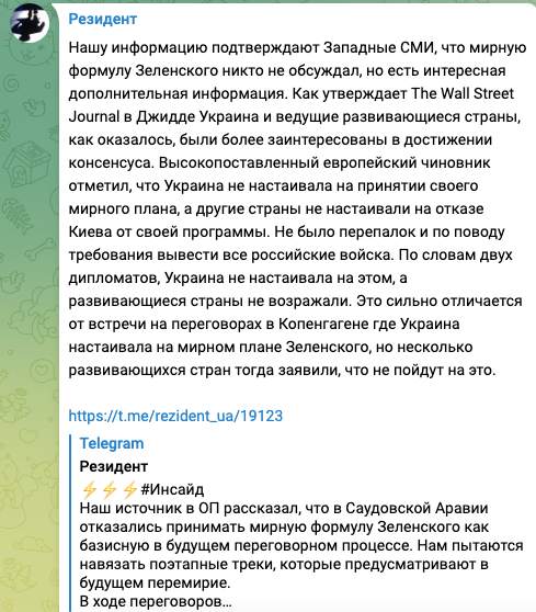 «Украина больше не настаивала на принятии своего мирного плана, а другие страны не настаивали на том, чтобы Киев отказался от него», — следует из публикации. Кроме того, газета сообщила, что Китай на переговорах по Украине в Джидде предложил учесть красные линии и опасения России.