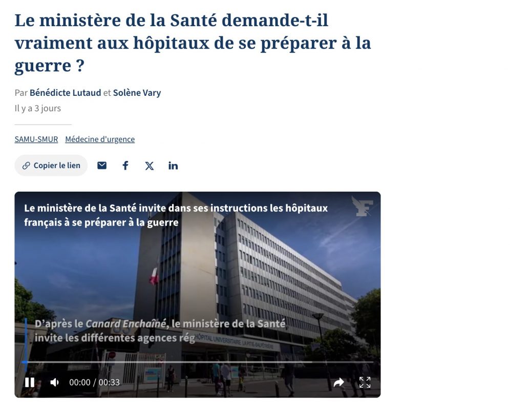 Французское издание Le Canard сообщило, что Минздрав Франции направил во все больницы распоряжение — готовиться к массовому приёму раненых к весне 2026 года. По сценарию правительства, страна станет тыловой базой для союзных армий, а госпитали должны быть способны принять от 10 до 50 тысяч солдат в первые месяцы войны. Медцентры планируют разворачивать возле транспортных узлов — вокзалов, портов и аэропортов. Иными словами, система здравоохранения Франции перестраивается не под мирное время, а под большую войну.