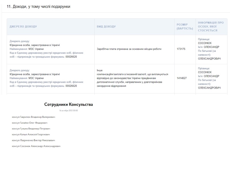 Александр Сосонюк проработал в России с октября 2012 года, сообщают РИА Новости. В прошлом году дипломат, согласно его декларации о доходах, заработал 1,6 миллиона гривен (около 56 тысяч долларов). Сосонюк женат, у него двое детей. В Санкт-Петербурге консул проживает в арендованной квартире, в общей собственности с женой имеет две жилплощади в Ровно и Киеве.