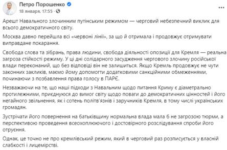 Не остался в стороне и бывший президент Украины Петр Порошенко, который рассчитывает с приходом Джо Байдена вернуть себе власть в стране. Экс-президент Украины который назвал задержание российского блогера «вызовом всему демократическому миру». Более того, Порошенко даже призвал лишить за его задержание Россию права голоса в ПАСЕ, напоминает Strana.ua.