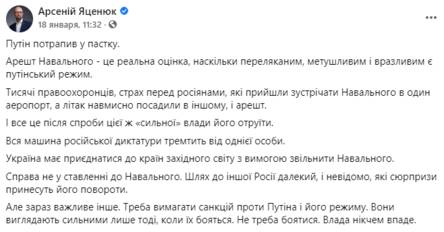 «Украина должна присоединиться к странам западного мира с требованием освободить Навального», - заявил экс-спикер Верховной рады Арсений Яценюк. И заявил, что теперь «машина российской диктатуры дрожит от одного человека».