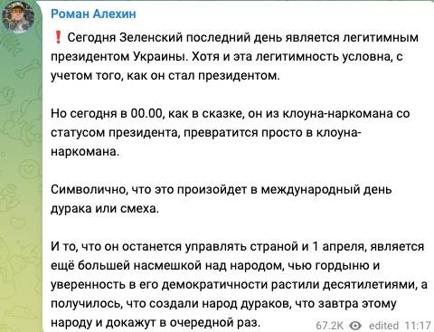 Как отмечает военкор Роман Алехин, украинского президента с большой натяжкой можно назвать легитимным. «Он из клоуна-наркомана в статусе президента превратится просто в клоуна-наркомана», написал в телеграм-канале военкор.