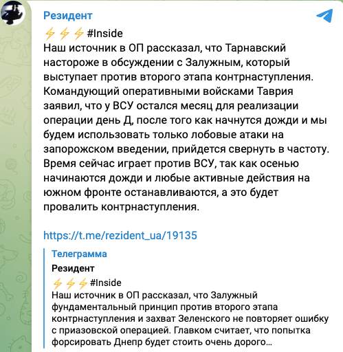 Как сообщает телеграм-канал «Резидент», имеющий свои источники в офисе президента Украины, на встрече возник спор между двумя генералами. Так, командующий оперативно-стратегической группировкой «Таврия» ВСУ Александр Тарнавский поспорил с главкомом ВСУ Валерием Залужным по поводу второго этапа контрнаступления. Залужный пытается убедить Зеленского не начинать второй этап, считая, что любая попытка форсировать Днепр будет стоит жизни еще сотням боевиков. Командир «Таврии» категорически против этого. Тарнавский считает, что наступать надо, так как у ВСУ остался только месяц : потом начнутся дожди, и это осложнит работу техники.