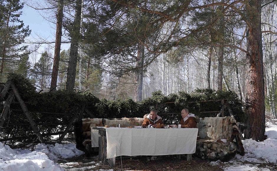 Затем Путин и Шойгу в одинаковых дубленках устроили пикник со скромными закусками и чаем из металлических кружек.
