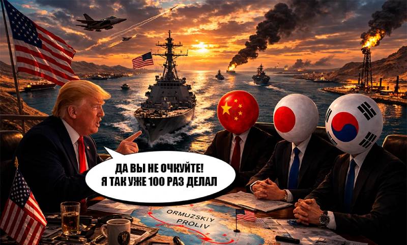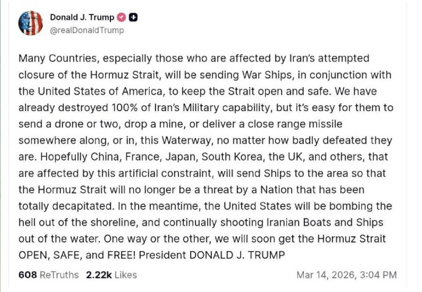 Как написал президент, США уже уничтожили военный потенциал Ирана, причем на все 100%. При этом Трамп как-то странно отметил, что независимо от того, что иранцы побеждены, они все-таки смогут отправить 1-2 дрона, которые сбросят мину на какой-то западный объект. Ну, или даже запустить ракету вдоль водного пути, честно признался президент. Но заверяет, что США будут начеку, и если что - будут «безжалостно бомбить береговую линию». Главное для Дональда Трампа, чтобы Китай, Франция, Япония, Южная Корея, Великобритания и другие страны, пострадавшие от этого искусственного ограничения, направили в Ормузский пролив свои корабли. Надо, чтобы полив перестал быть угрозой со стороны Ирана, «который был полностью обезглавлен», нацелил Трамп своих «партнеров».