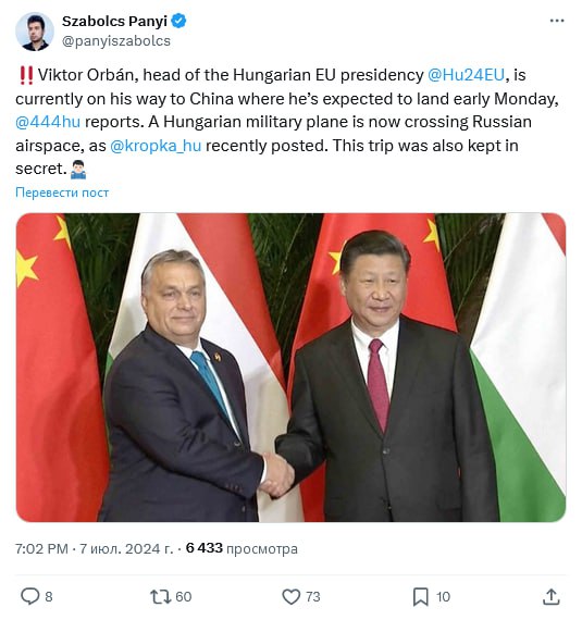 «Виктор Орбан, глава председательства Венгрии в ЕС, в настоящее время находится на пути в Китай, где он, как ожидается, приземлится рано утром в понедельник. Венгерский военный самолет сейчас пересекает воздушное пространство России, как недавно опубликовал. Эта поездка тоже держалась в секрете», — пишет журналист.