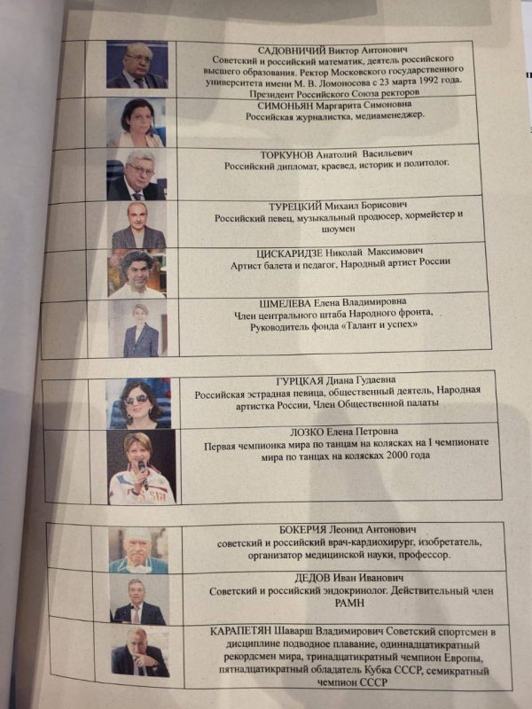 Также поддержку Путина окажут телеведущие федеральных каналов, включая Юлию Барановскую (бывшую жену футболиста Андрея Аршавина), военных корреспондентов, публициста Евгения Прилепина, хирурга Леонида Рошаля. Важно отметить, что в список включен глава народного совета ДНР Владимир Жога, через которого Путин объявил о своем намерении баллотироваться.