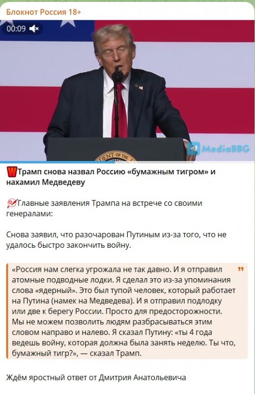 Досталось и Дмитрию Медведеву. Трамп, не стесняясь выражений, назвал зампреда Совбеза РФ «тупым человеком» и рассказал, что как только тот «упомянул слово «ядерный»», он тут же приказал отправить к российским берегам пару атомных подводных лодок. Чисто «для предосторожности», чтобы никто не смел «разбрасываться такими словами». Звучит эпично, но если вдуматься — это скорее напоминает сюжет дешевого сериала, где герой устрашает злодеев картонными спецэффектами.