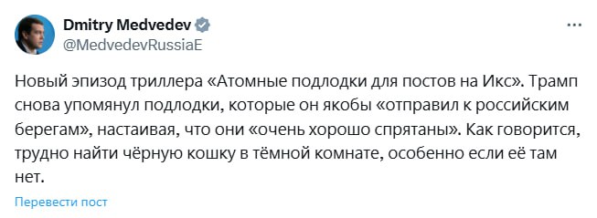 Сам Дмитрий Медведев не остался в стороне и ответил в соцсетях. Его комментарий можно смело отправлять на фестиваль политической сатиры: он сравнил слова Трампа с «лютым голливудским триллером» и «классикой американского кино категории B». А потом добавил цитату из советского детективного сериала: мол, «трудно найти черную кошку в темной комнате, особенно если ее там нет». Переводя с дипломатического на человеческий язык: никаких подлодок у берегов России никто так и не увидел.