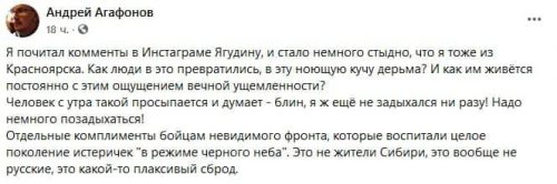 Судя по скриншотам, которые утекли в Сеть, автор поста завил, что после чтения комментариев на странице Ягудина ему стало стыдно, что он тоже из Красноярска.
