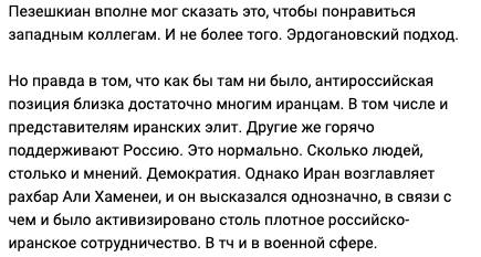 К слову сказать, это подтвердил телеканалу «Царьград» и иранский журналист Хаял Муаззин. Он сказал, что слова президента могут показаться разноречивыми, но их стоит воспринимать как часть «тонкой дипломатической стратегии Ирана в контексте глобальных и региональных вызовов».