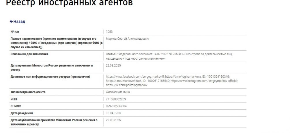 Политолога Сергея Маркова* 22 августа объявили иностранным агентом. Эта информация есть на сайте Министерства юстиции РФ. Основанием для включения в список стала статья 7 закона «О контроле за деятельностью лиц, находящихся под иностранным влиянием». По данным Минюста, Марков* принимал участие в распространении материалов других иноагентов, выступал на иностранных площадках, а также «распространял недостоверную информацию.
